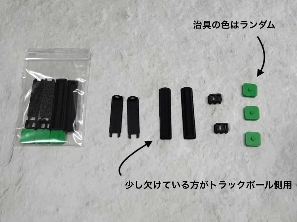 Section titled “片側トラックボールの場合”3D プリント製パーツは非常に小さく種類もたくさんあります。 組み立て前に全てのパーツが入っているか確認お願いします。