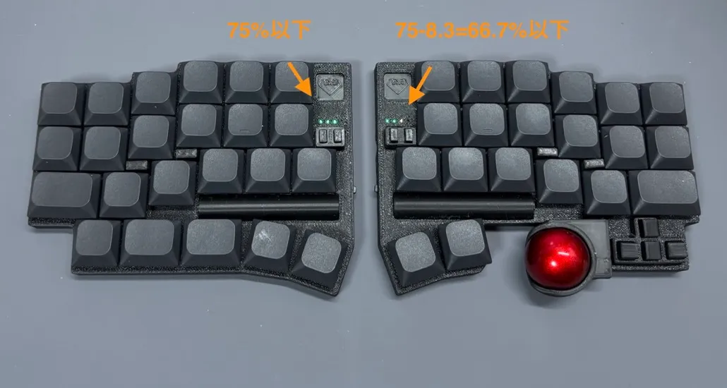 Section titled “残量を確認する方法”電源を切らずに残量を確認するためには、 Config(下の赤いキー) + Z を押します。 しばらくの間 LED が電池残量を表示します。
